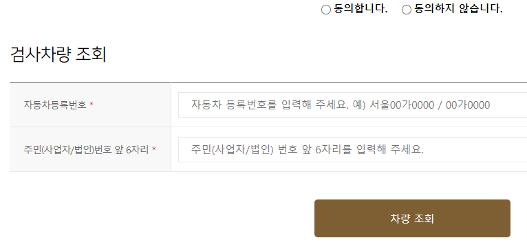 개인정보 수집 이용에 동의한 후, 자동차등록번호, 주민번호 앞 6자리를 입력하고 차량 조회를 클릭합니다.